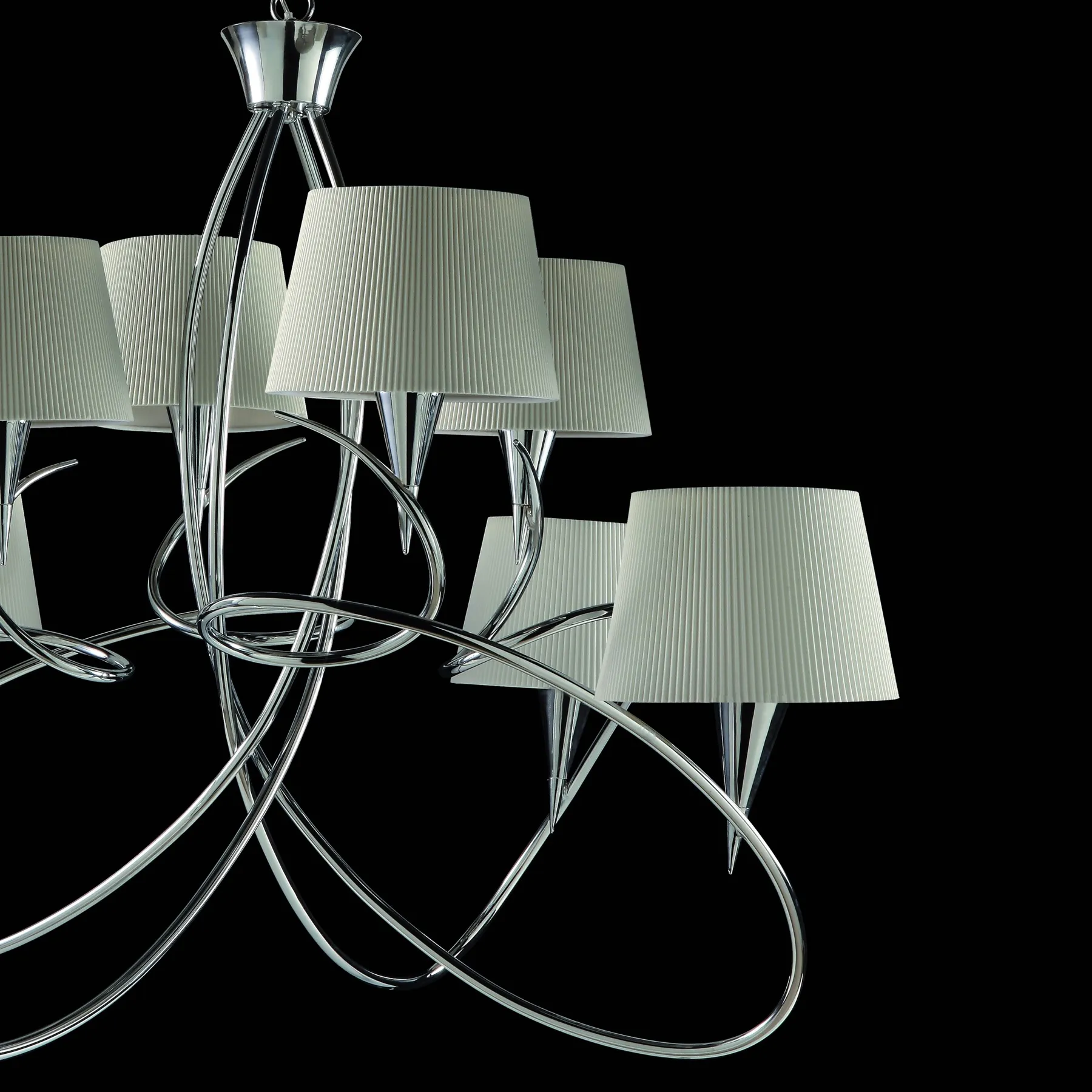 коллекция имеет яркую отполированную хромированную или латунную отделку. Металлическая конструкция сочетается с белыми оттенками плиссированных тканей абажура, создавая индивидуальные решения для вашего интерьера.